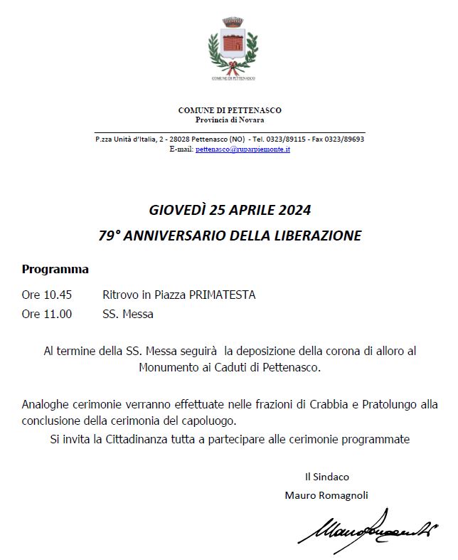 Analoghe cerimonie verranno effettuate nelle frazioni di Crabbia e Pratolungo alla conclusione