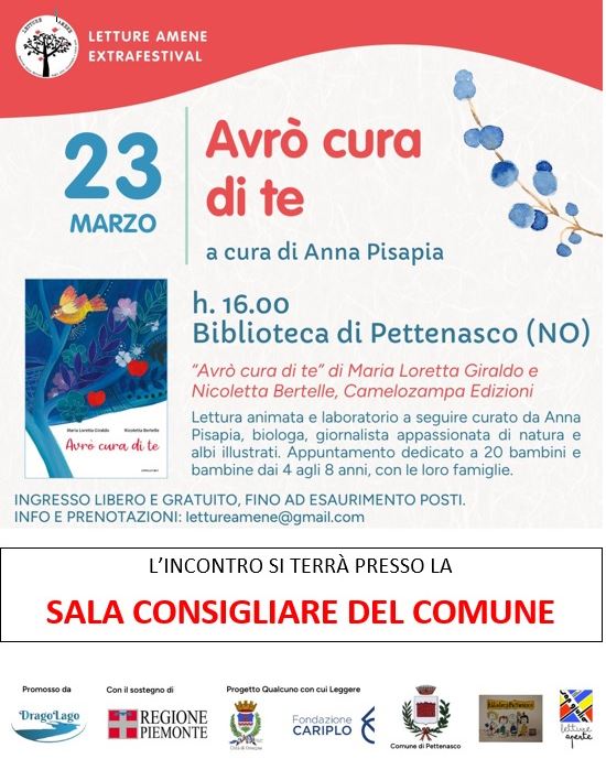 Ecco il prossimo speciale appuntamento per Sabato 23 Marzo ore 16.00! Nell'ambito dell'extrafestival letture amene, nella Sala Consiliare del Comune di Pettenasco si svolgerà "Avrò cura di te" a cura di Anna Pisapia che accompagnerà fino a 20 bambini (dai 4 agli 8 anni) e le loro famiglie attraverso un'appassionante lettura animata e laboratorio!