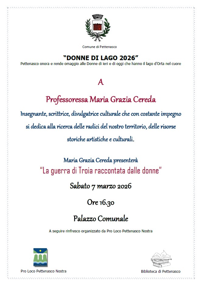 Il Comune di Pettenasco, insieme alla Biblioteca di Pettenasco e alla Pro Loco Pettenasco Nostra, invita tutta la cittadinanza a un appuntamento speciale dedicato alle donne di ieri e di oggi che hanno il lago d’Orta nel cuore.