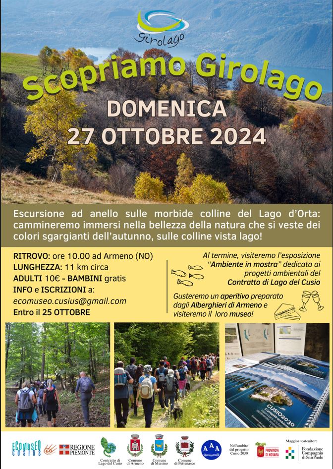 il prossimo 27 ottobre 2024 Ecomuseo organizzerà una camminata "Scopriamo Girolago" lungo i sentieri del Lago d'Orta con partenza e arrivo da Armeno.