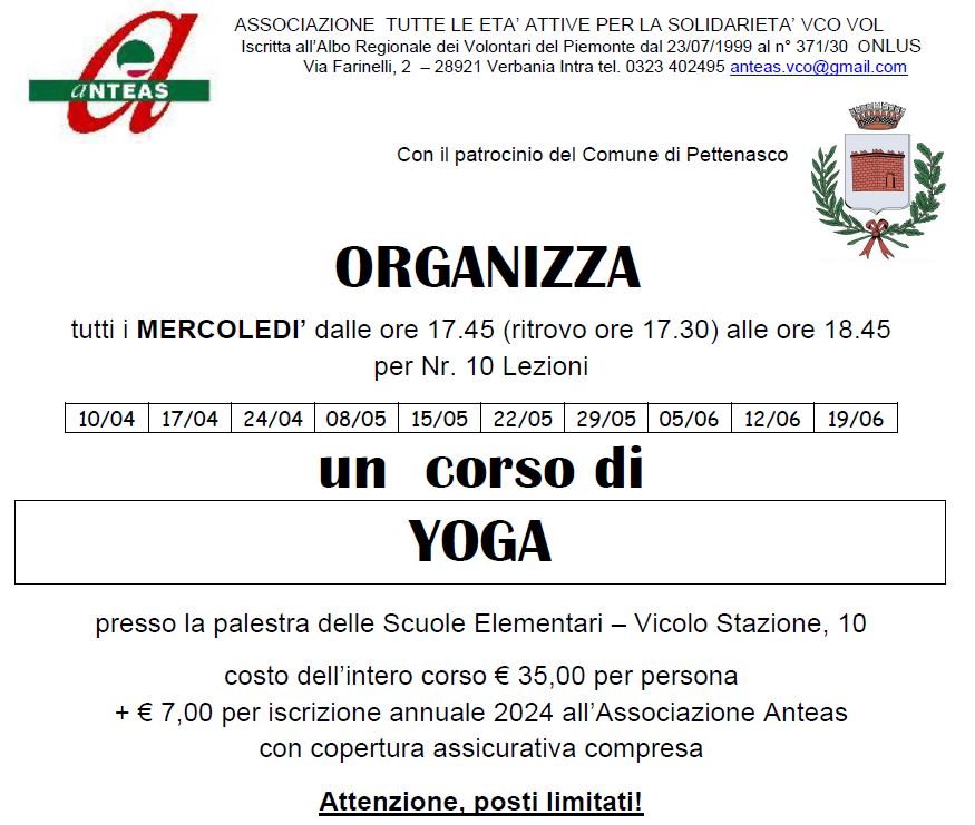 📢 Nuovo corso di Yoga organizzato dall'Associazione ANTEAS con il patrocinio del Comune di Pettenasco! 🏋️♀️