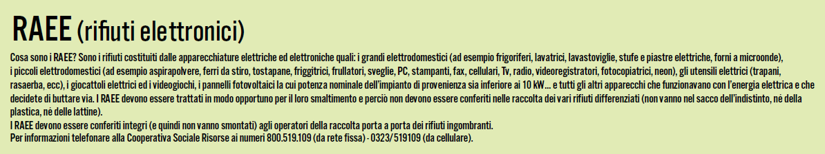 Maggiori informazioni nella scheda allegata "cosa sono i RAEE" e sul calendario di raccolta differenziata.