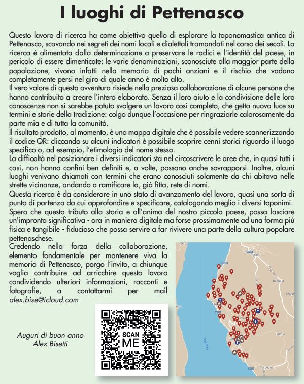 Credendo nella forza della collaborazione, elemento fondamentale per mantenere viva la memoria di Pettenasco, porgo l’invito, a chiunque voglia contribuire ad arricchire questo lavoro condividendo ulteriori informazioni, racconti e fotografie, a contattarmi per mail alex.bise@icloud.com
