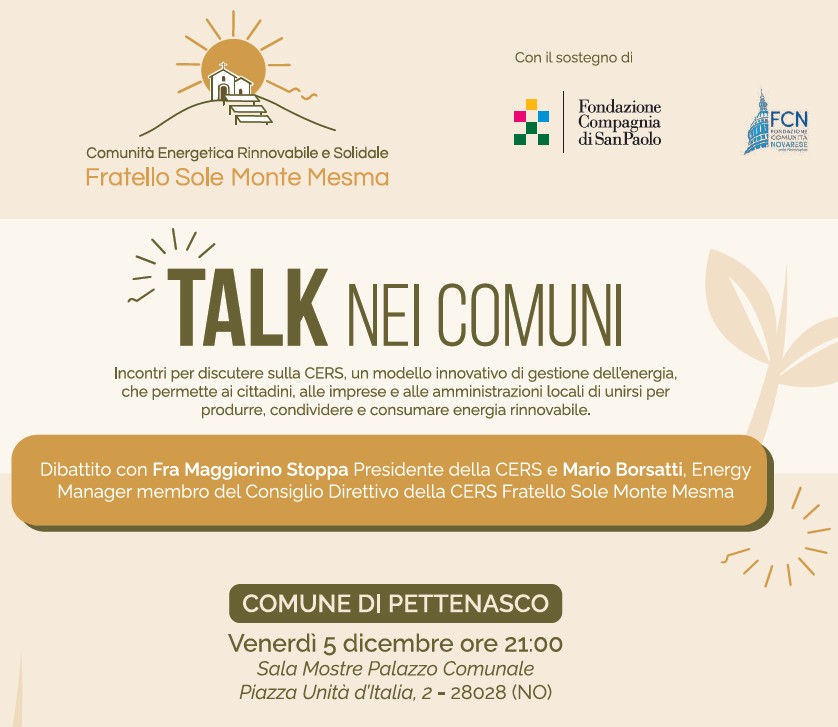Ti invitiamo a un incontro dedicato alla Comunità Energetica Rinnovabile e Solidale Fratello Sole Monte Mesma, per scoprire da vicino come funziona questo modello innovativo e quali opportunità concrete può portare sul nostro territorio.