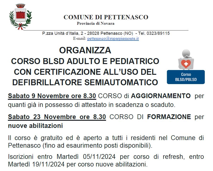 Il Comune di Pettenasco ORGANIZZA CORSO BLSD ADULTO E PEDIATRICO CON CERTIFICAZIONE ALL’USO DEL DEFIBRILLATORE SEMIAUTOMATICO