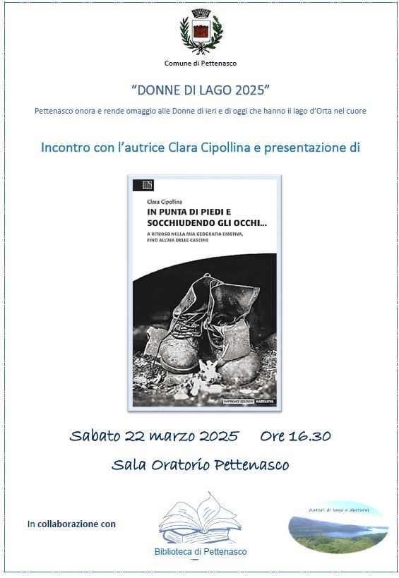 Il Comune di Pettenasco è orgoglioso di onorare le Donne di ieri e di oggi che hanno il Lago d'Orta nel cuore. Unisciti a noi per un incontro speciale con l’autrice Clara Cipollina e la presentazione del suo libro "In punta di piedi e socchiudendo gli occhi...".