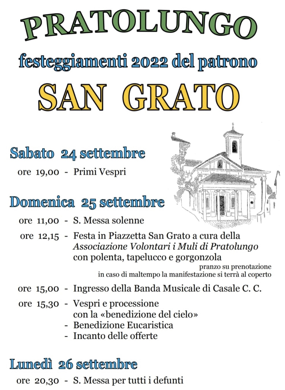 In allegato locandina con il programma dei festeggiamenti di San Grato 2022 a Pratolungo e l'evento San Grato in Piazza! organizzato dall'Associazione i Muli.