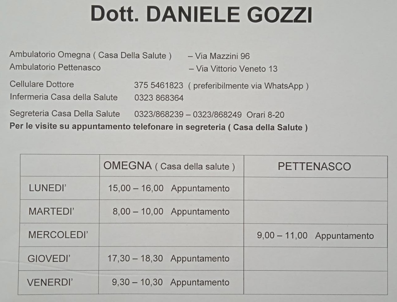 Durante il resto della settimana, potrete trovare il Dottor Gozzi presso la Casa della Salute di Omegna.