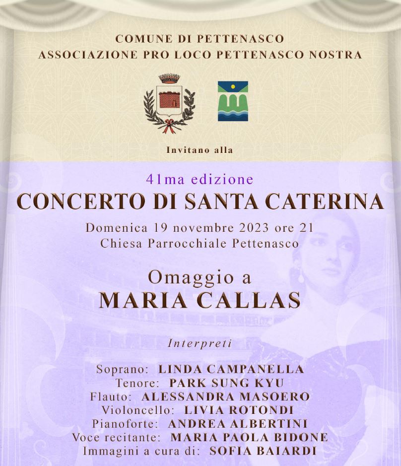 Un evento imperdibile che si terrà domenica 19 novembre 2023, alle ore 21.00, presso la Chiesa Parrocchiale di Pettenasco. Quest'anno, renderemo omaggio alla straordinaria Maria Callas, una delle voci più celebri della storia dell'opera.