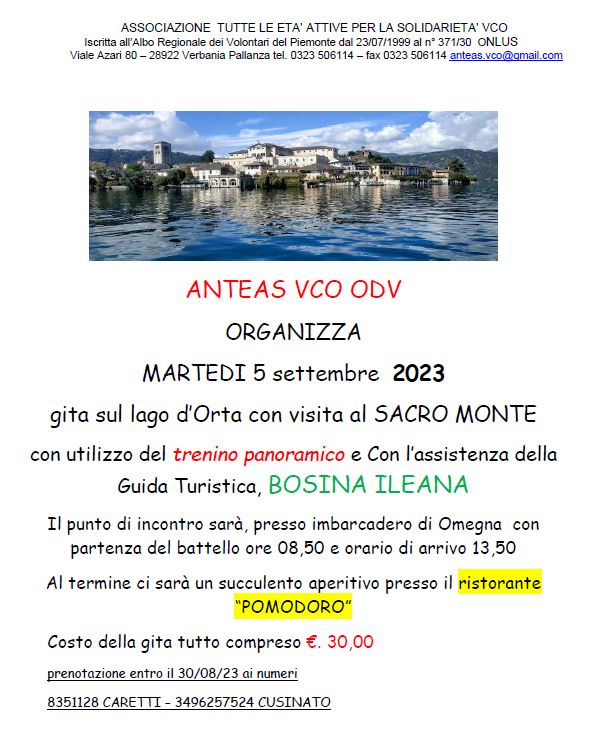 ANTEAS VCO ODV ORGANIZZA MARTEDI 5 settembre 2023 gita sul lago d’Orta con visita al SACRO MONTE