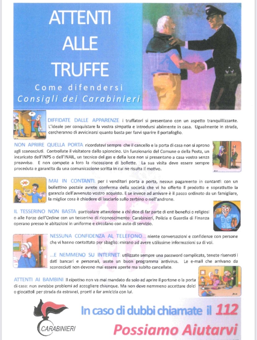 Pubblichiamo in allegato una utile breve guida con alcuni consigli realizzata dai Carabinieri per difendersi dai tentativi di truffe.