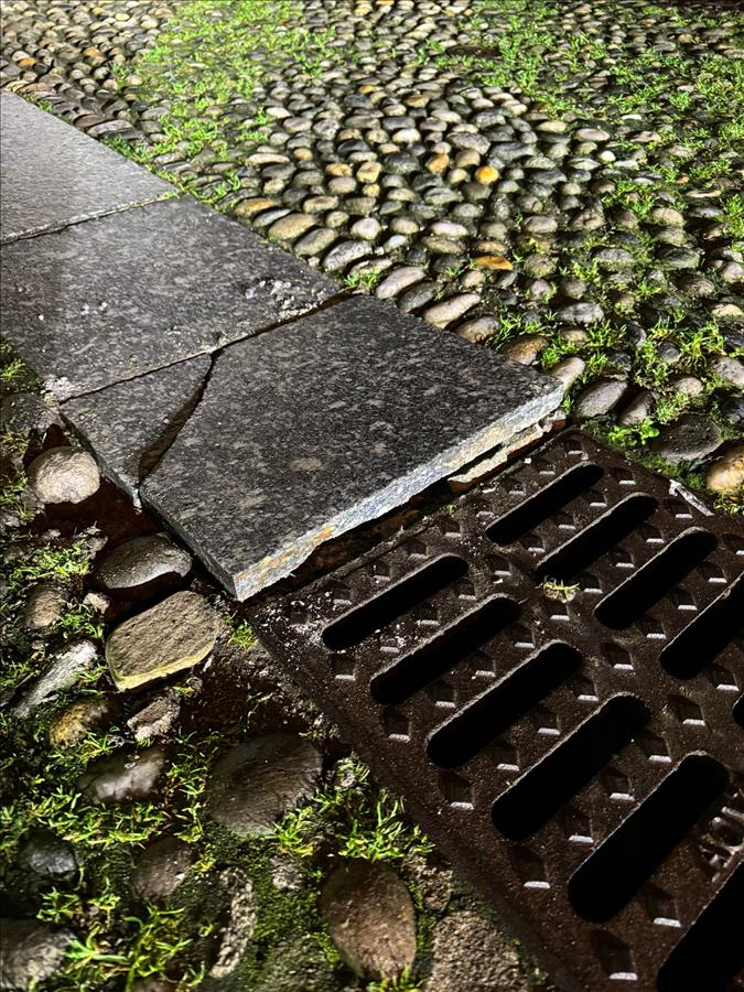 Description Lastra rotta vicino ad un tombino in Via Gaetano Fara.