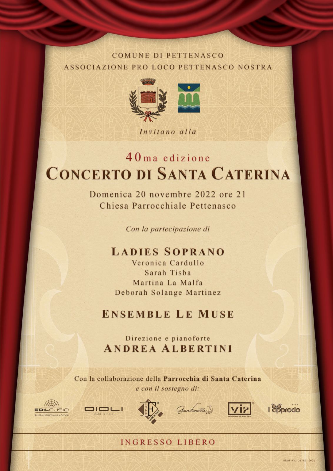 Con piacere l’Amministrazione comunale ha offerto il proprio contributo affinché il tradizionale Concerto di Santa Caterina potesse tornare per la quarantesima edizione con un’esibizione in presenza e di consueta qualità. Un’occasione per la nostra comunità di ritrovare il gusto di condividere emozioni resa possibile grazie all’operosità di Elisabetta Zucchi, al generoso sostegno di realtà del territorio, della Pettenasco Nostra e della Parrocchia.