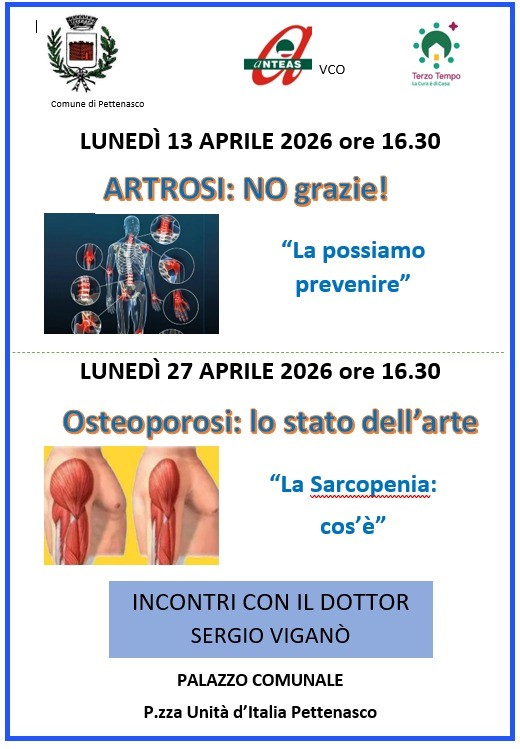 🩺 Il Comune, in collaborazione con ANTEAS VCO e La Cura di Casa, invita la cittadinanza a due appuntamenti dedicati alla salute delle ossa e delle articolazioni con il Dott. Sergio Viganò.