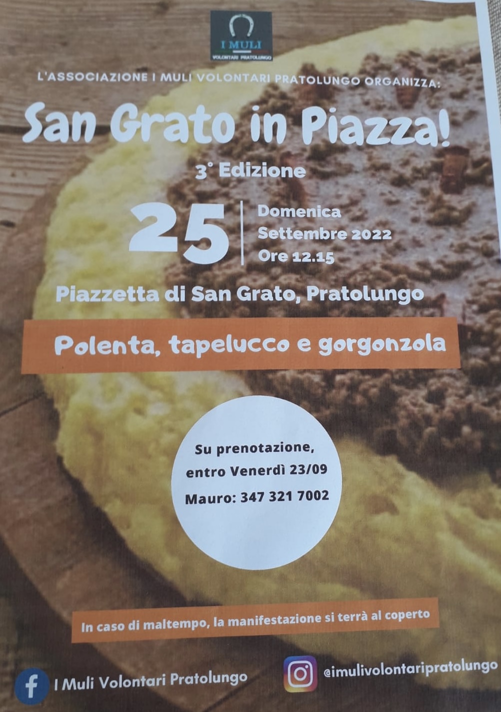 In allegato locandina con il programma dei festeggiamenti di San Grato 2022 a Pratolungo e l'evento San Grato in Piazza! organizzato dall'Associazione i Muli.