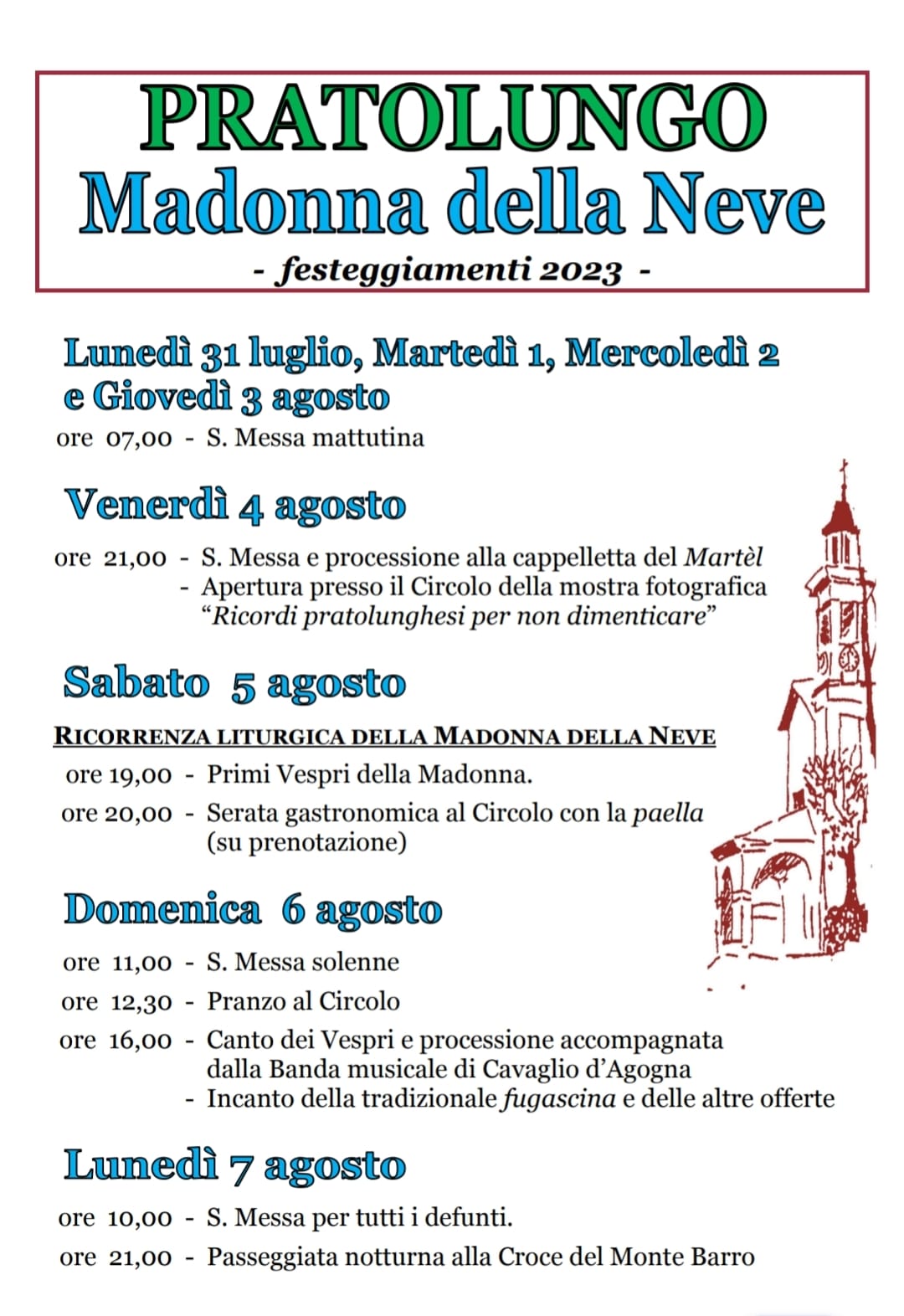 Pubblichiamo in allegato il programma dei festeggiamenti per la Madonna della Neve 2023 a Pratolungo.