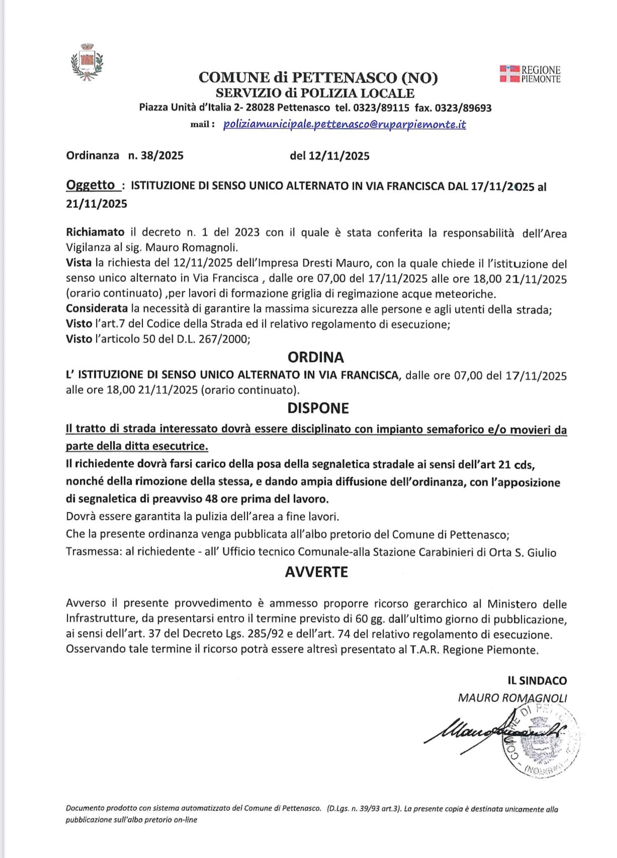 In allegato ordinanza di Istituzione senso unico alternato in Via Francisca dal 17 al 21/11/2025, h24, per lavori di realizzazione griglia di regimazione acque meteoriche.